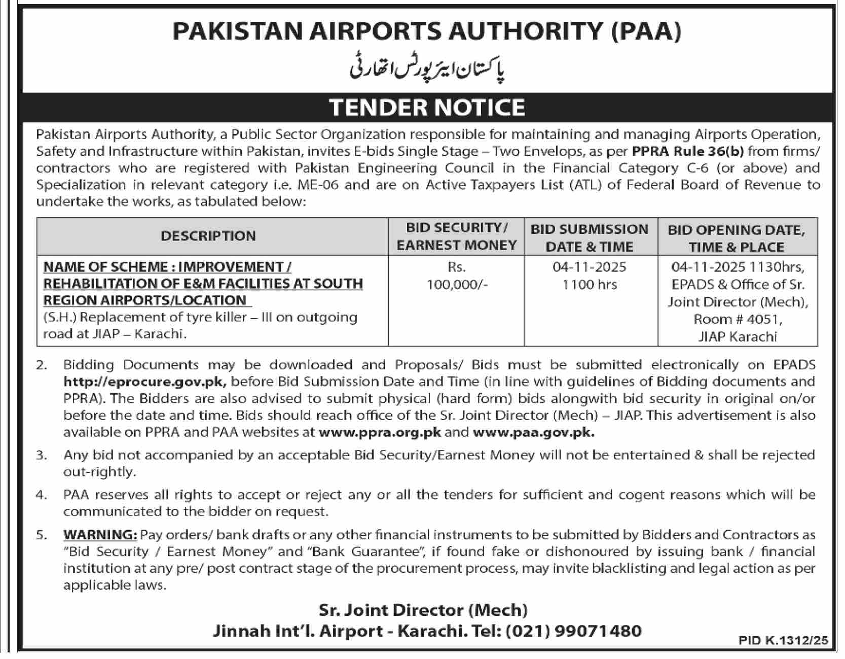 Pakistan Airport Authority Karachi Tender Notice 1