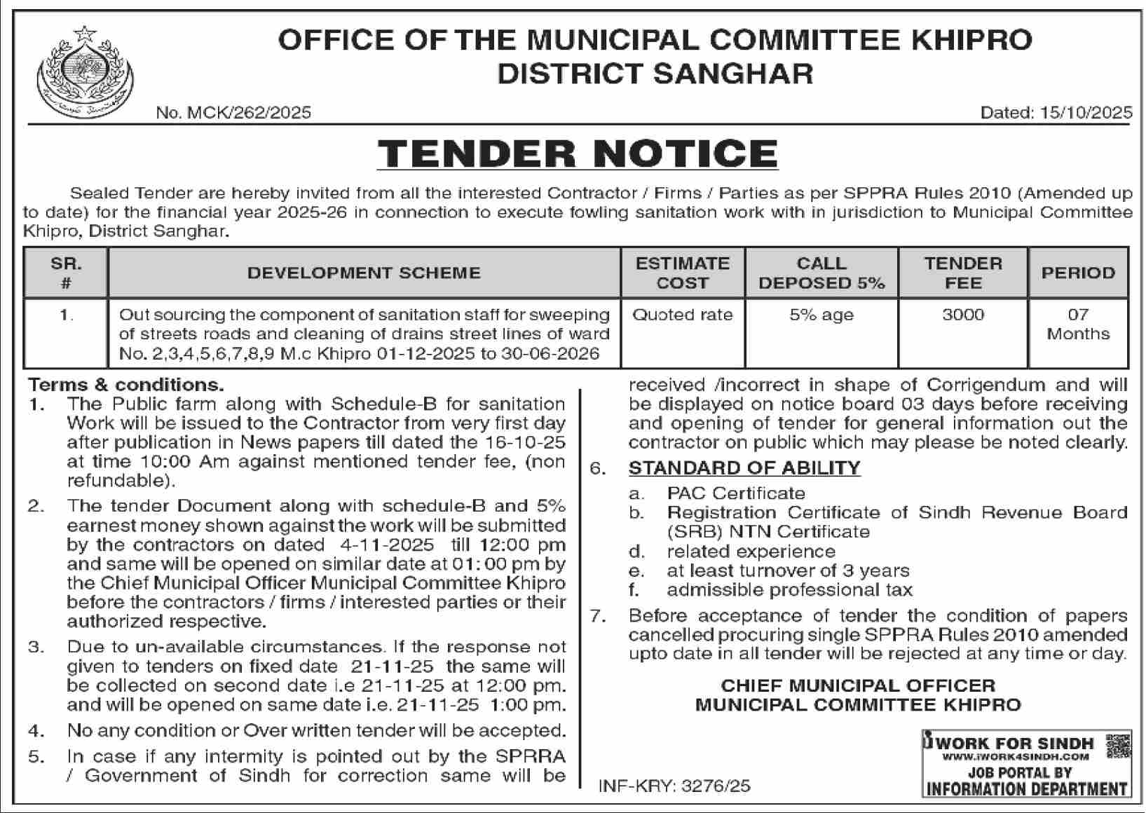 Public Health Engineering Division Tando Muhammad Khan Tender Notice