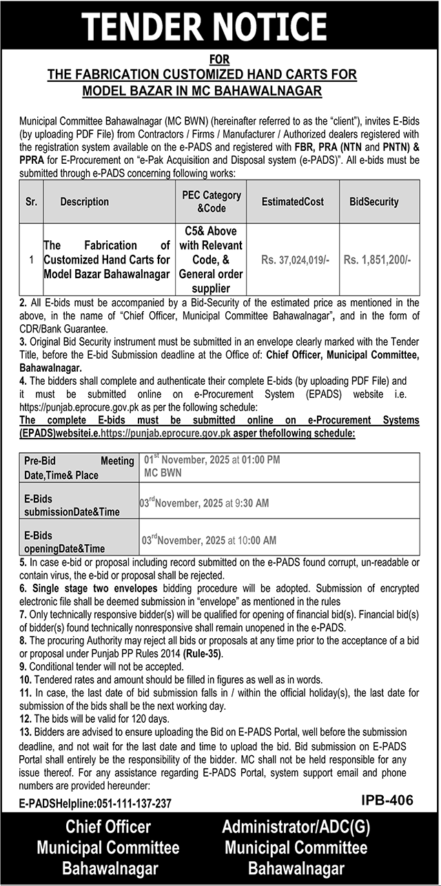 Municipal Committee Bahawalnagar Tender Notice