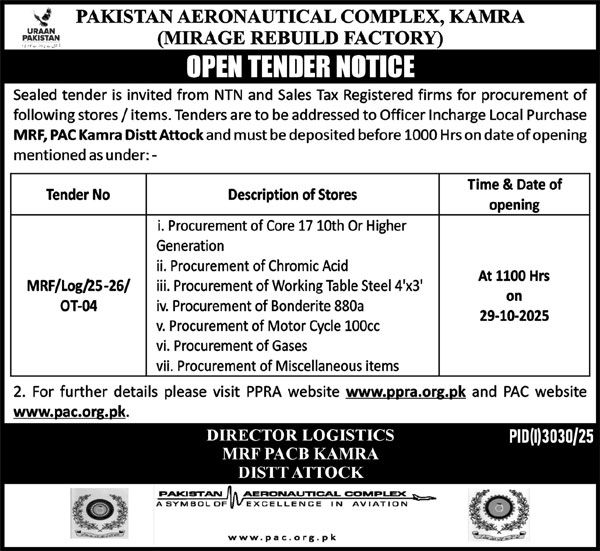 Pakistan Aeronautical Complex Kamra Tender Notice