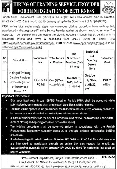 Punjab Skill Development Fund Lahore Tender Notice | IndoPakWork