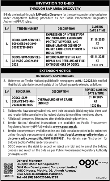 Oil & Gas Development Company Limited Islamabad Tender Notice