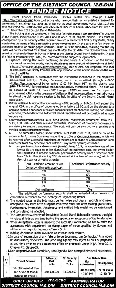 District Council Mandi Bahauddin Tender Notice | IndoPakWork