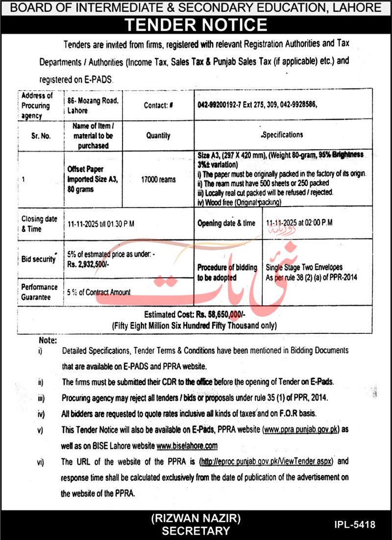 Board of Intermediate & Secondary Education Lahore Tender Notice