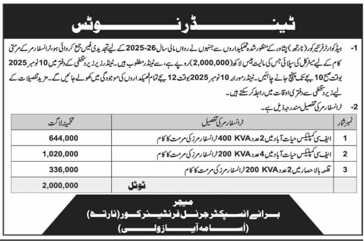 Headquarter Frontier Corps Peshawar Tender Notice | IndoPakWork