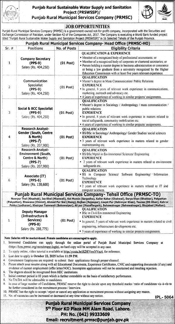 Punjab Rural Municipal Services Company Lahore Jobs