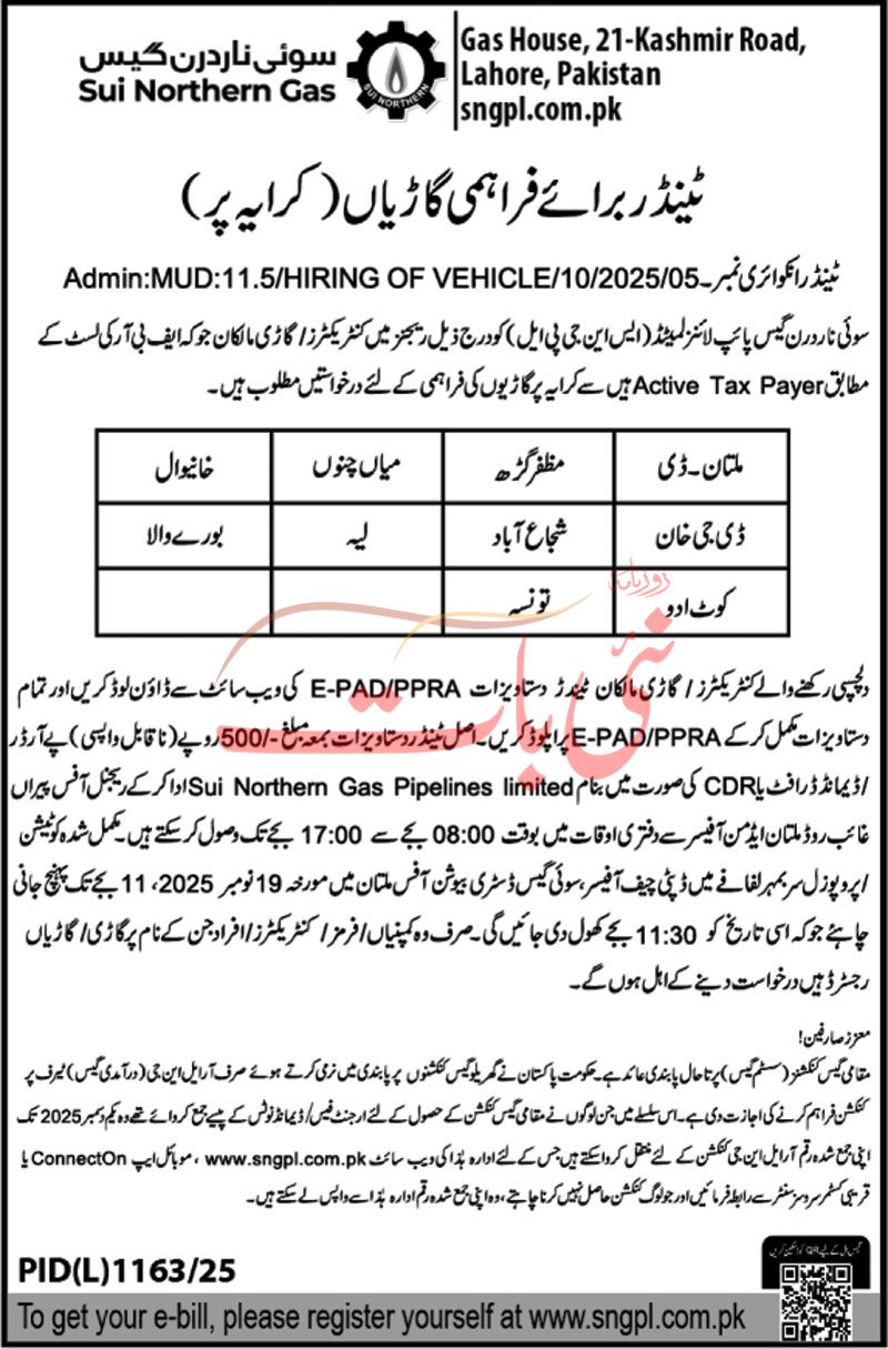 Sui Northern Gas Company Limited Lahore Tender Notice