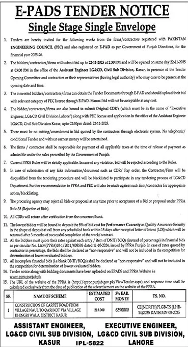 LG&CD Civil Sub Division Lahore, Kasur Tender Notice