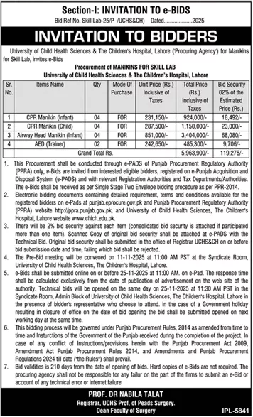 University of Child Health Sciences Tender Notice