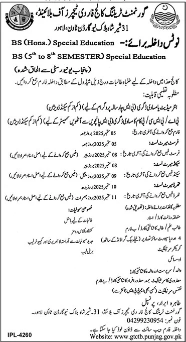 Admissions Open in Govt Training College for the Teachers of Blind Lahore
