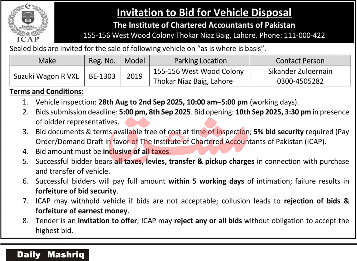 The Institute of Chartered Accountants of Pakistan Lahore Tender Notice