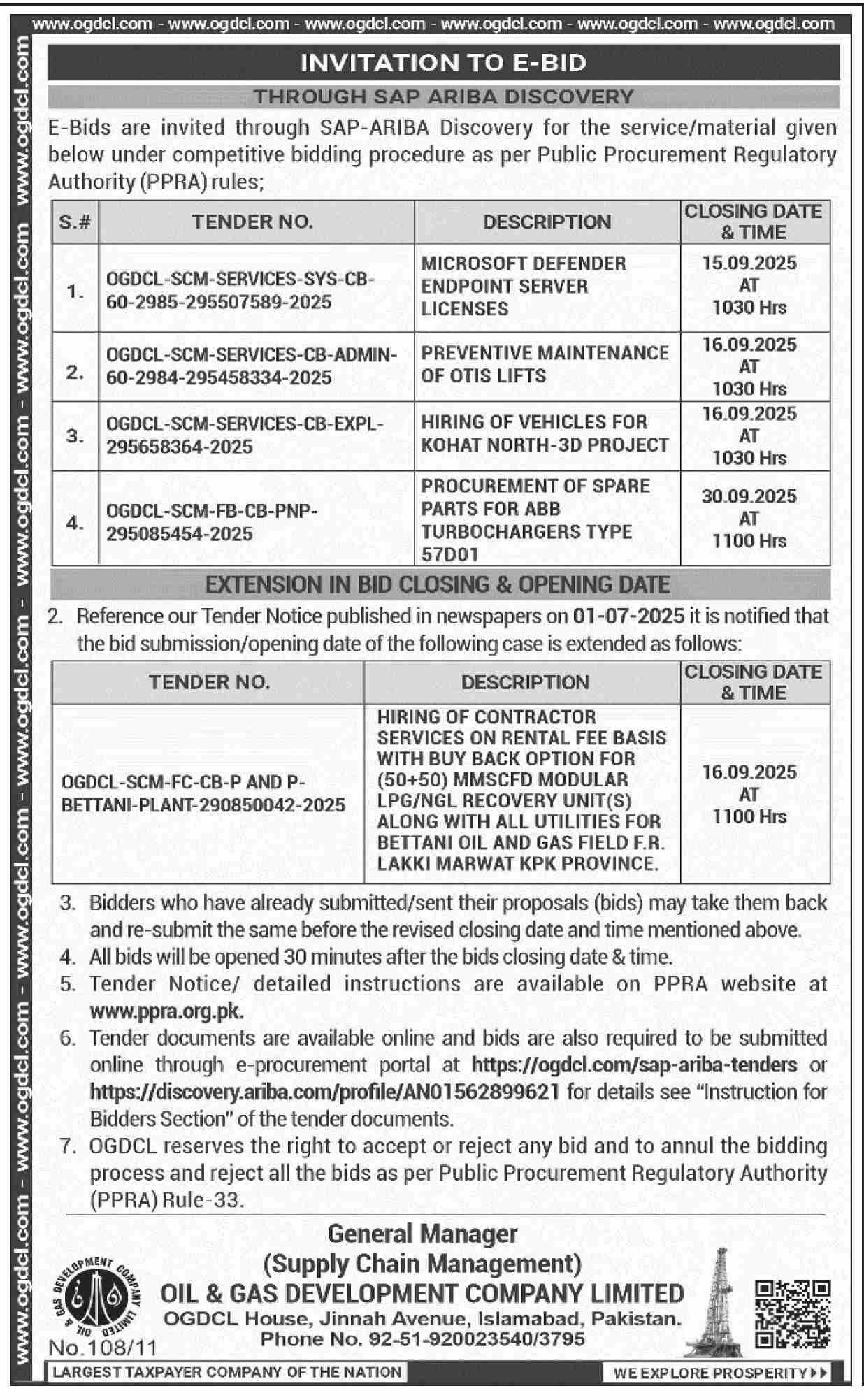 Oil & Gas Development Company Limited Islamabad Tender Notice