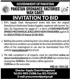 Pakistan Ordnance Factories Wah Cantt Tender Notice