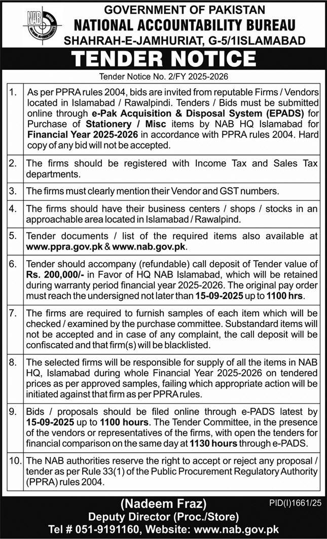 National Accountability Bureau Islamabad Tender Notice