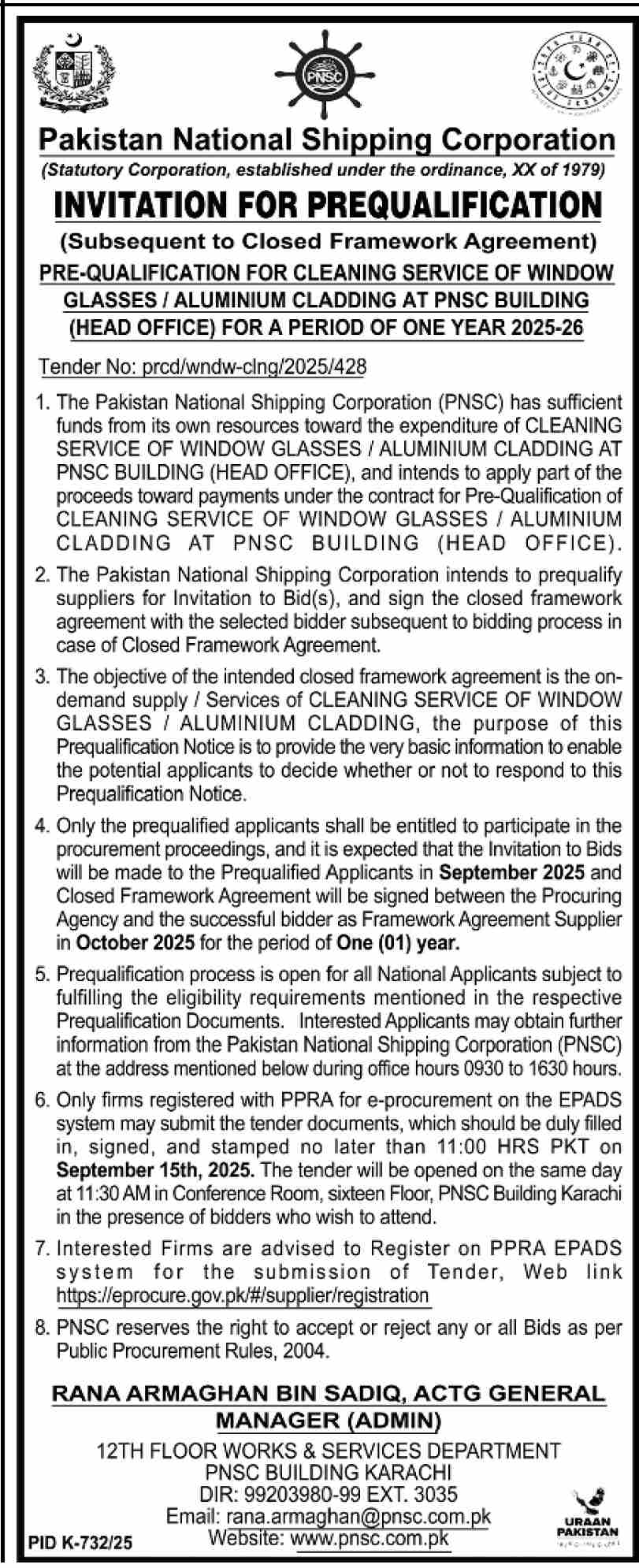 Pakistan National Shipping Corporation Karachi Tender Notice