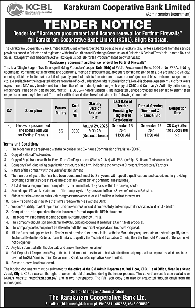 Karakuram Cooperative Bank Limited Gilgit Tender Notice