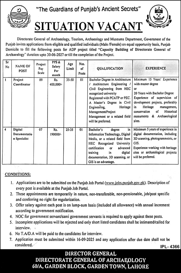Jobs in Archaeology, Tourism, Archaeology & Museums Department Lahore