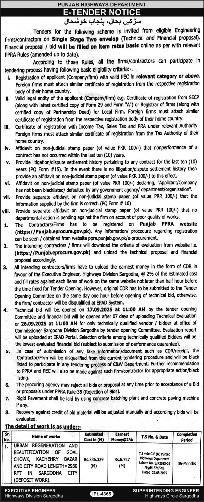 Punjab Highway Department Sargodha Tender Notice