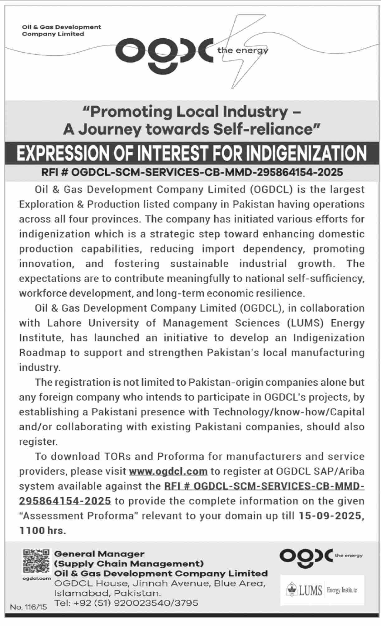 Oil & Gas Development Company Limited Islamabad Tender Notice