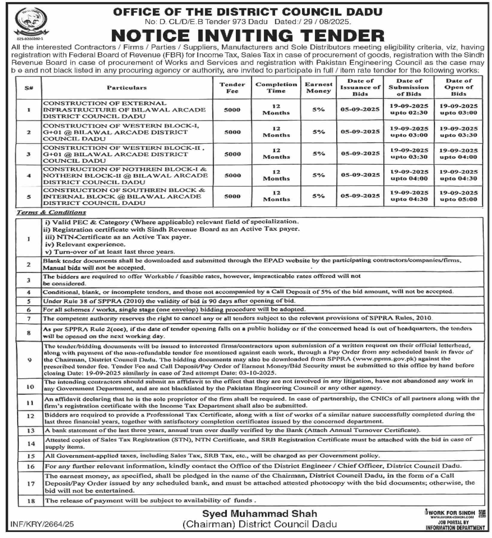 District Council Dadu Tender Notice