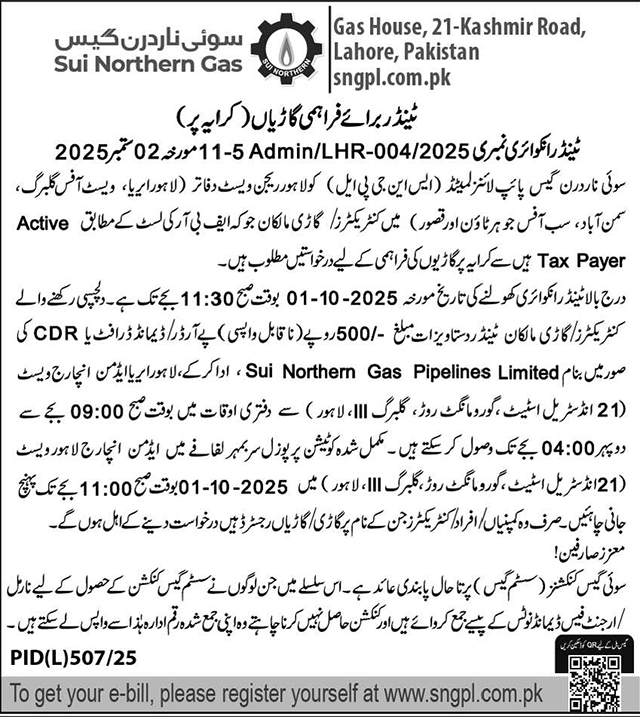 Sui Northern Gas Company Limited Lahore Tender Notice