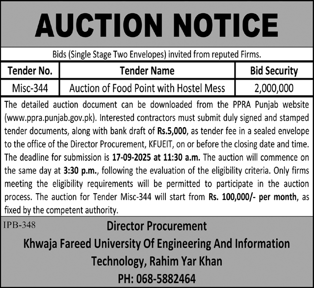 Khawaja Fareed University of Engineering & Information Technology Rahim Yar Khan Tender Notice