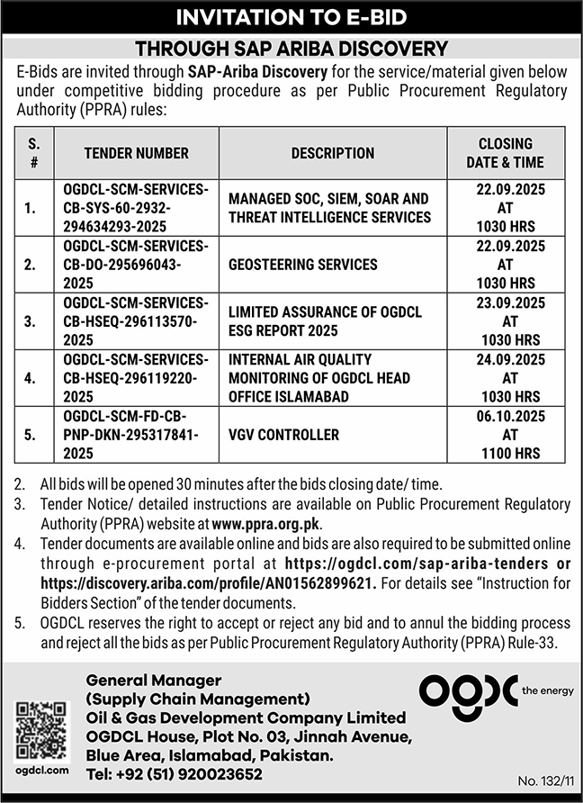 Oil & Gas Development Company Limited Islamabad Tender Notice