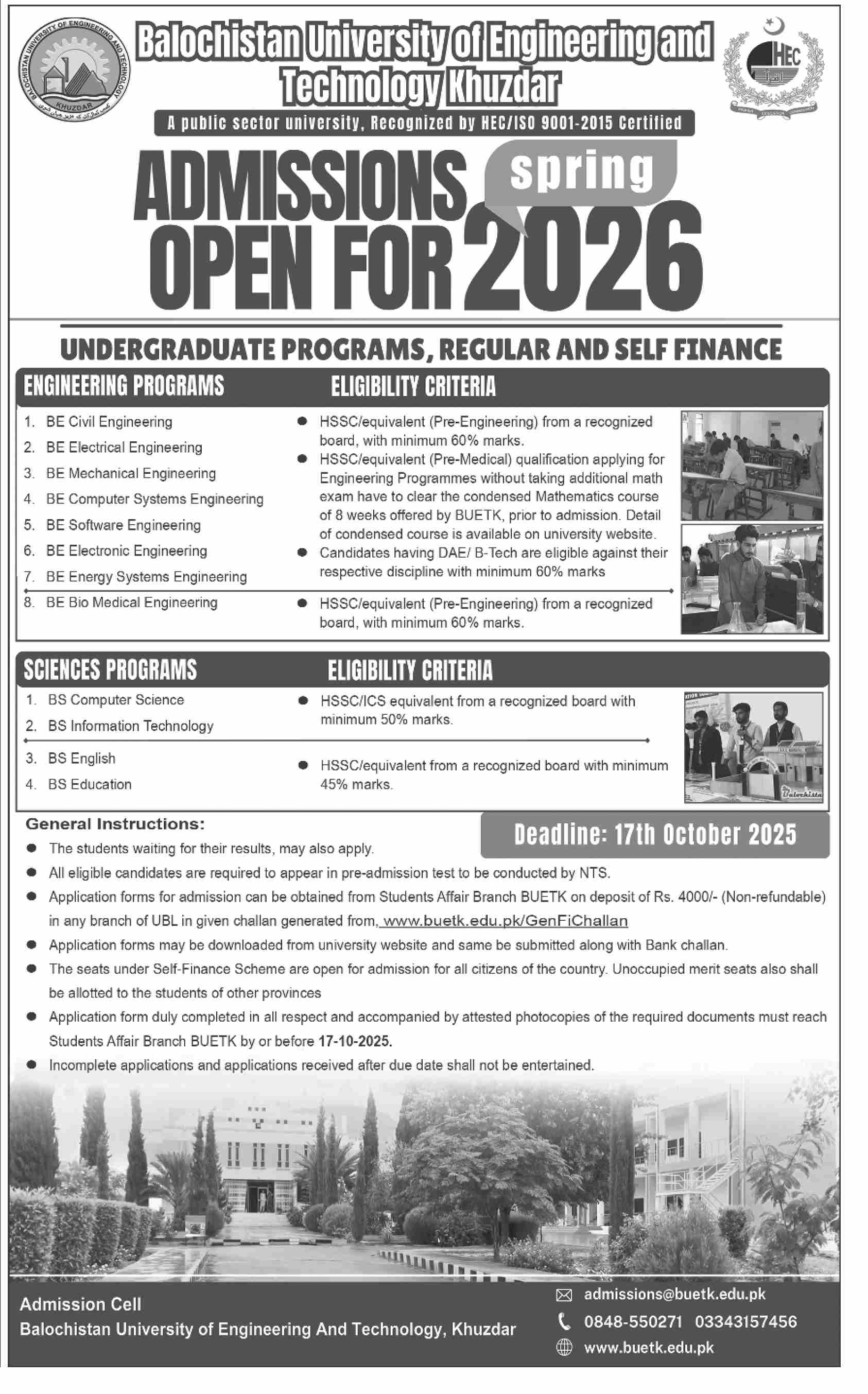 Admission Open in Balochistan University of Engineering & Technology Khuzdar