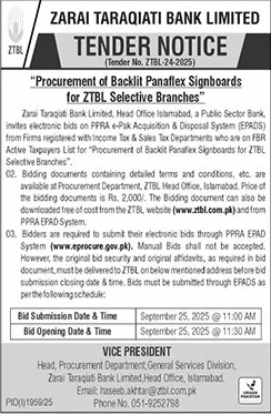 Zarai Taraqiati Bank Limited Islamabad Tender Notice