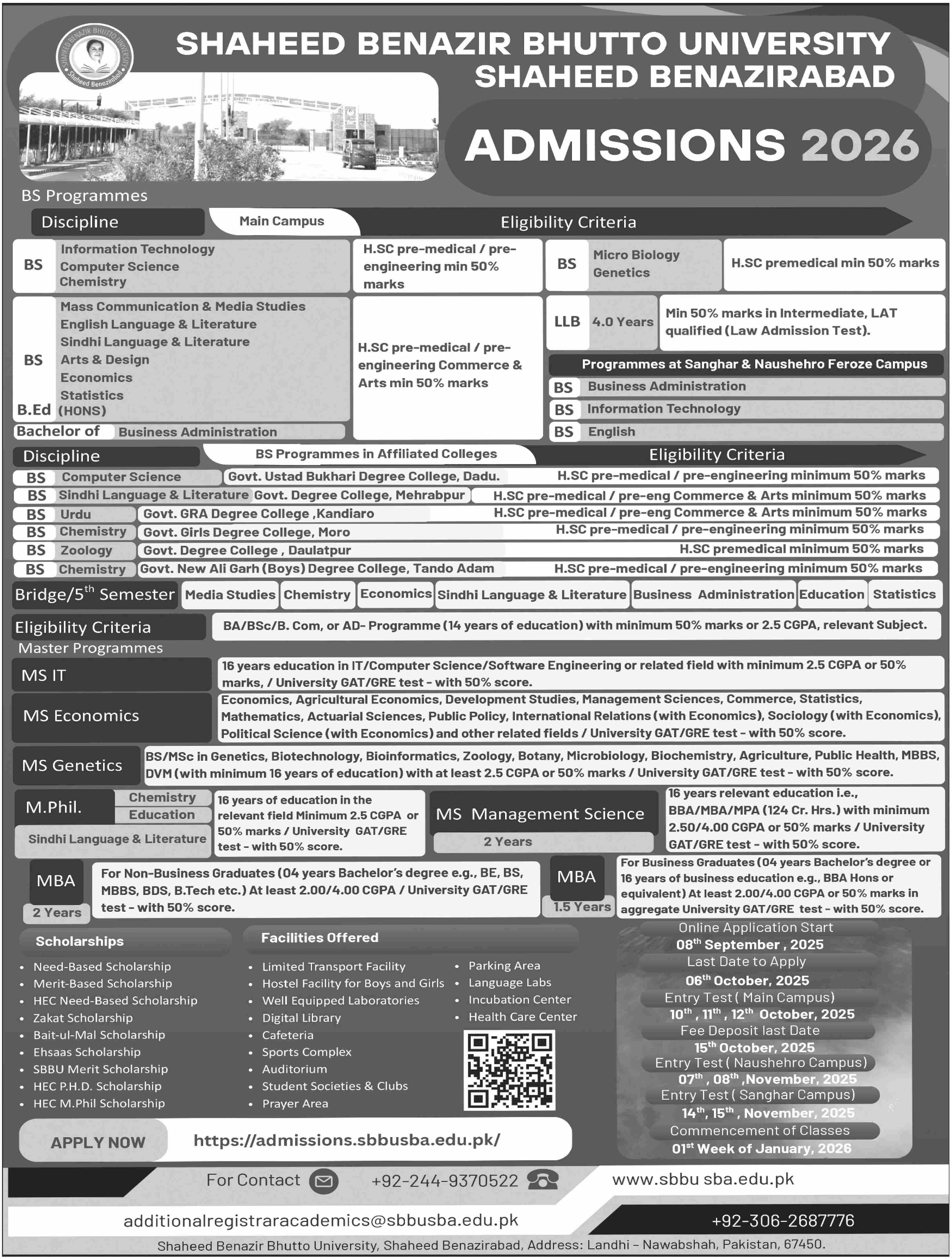 Admission Open in Shaheed Benazir Bhutto University Shaheed Benazirabad
