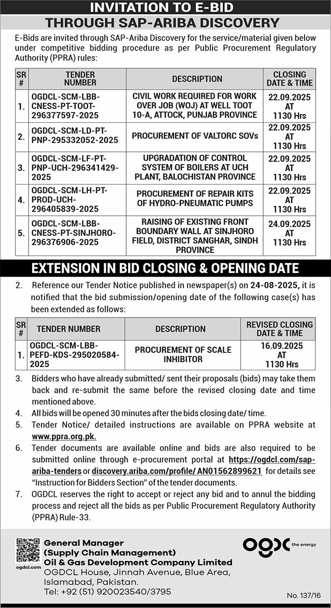Oil & Gas Development Company Limited Islamabad Tender Notice-1