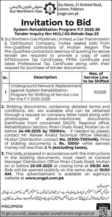 Sui Northern Gas Company Limited Lahore Tender Notice-1