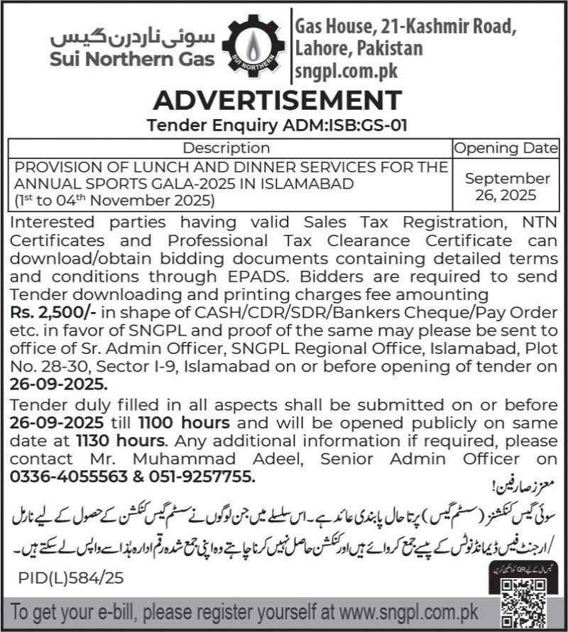 Sui Northern Gas Company Limited Lahore Tender Notice