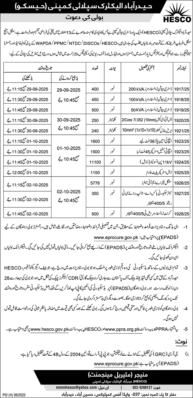 Hyderabad Electric Supply Company Limited Tender Notice