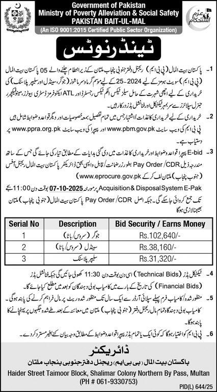 Ministry of Poverty Alleviation & Social Safety Pakistan Tender Notice
