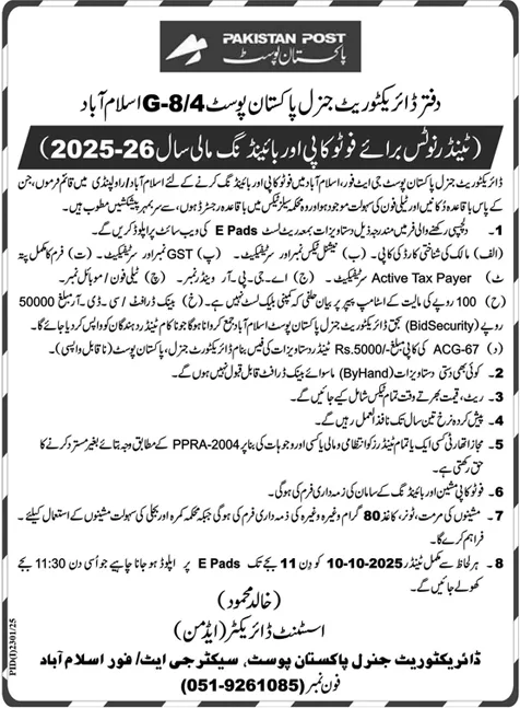 Pakistan Post Islamabad Tender Notice