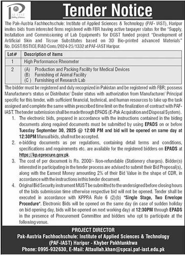 The Pak Austria Fachhochschule Institute of Science & Technology Haripur Tender Notice