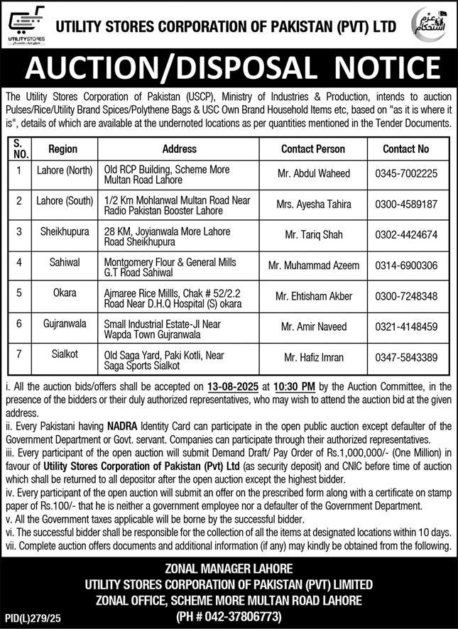 Utility Stores Corporation of Pakistan Lahore Tender Notice