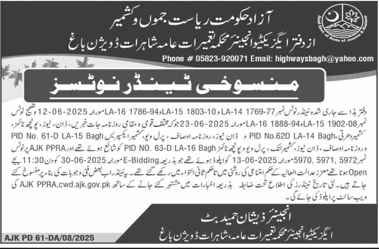 Azad Govt of State of Jammu & Kashmir Karachi Tender Notice
