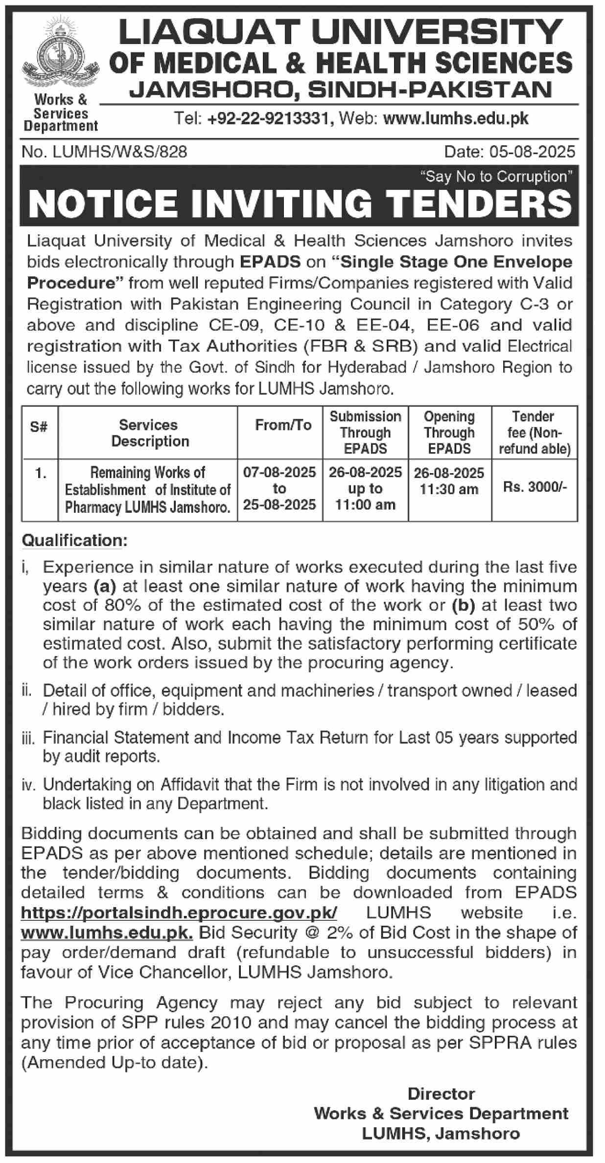 Liaqat University of Medical & Health Sciences Jamshoro Tender Notice