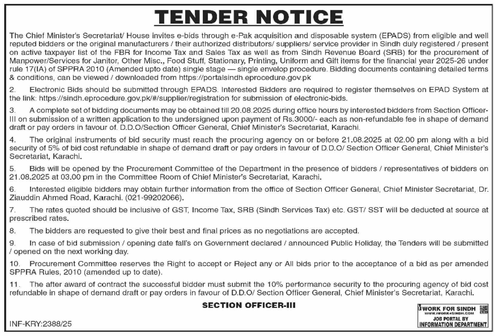 Azad Govt of State of Jammu & Kashmir Karachi Tender Notice