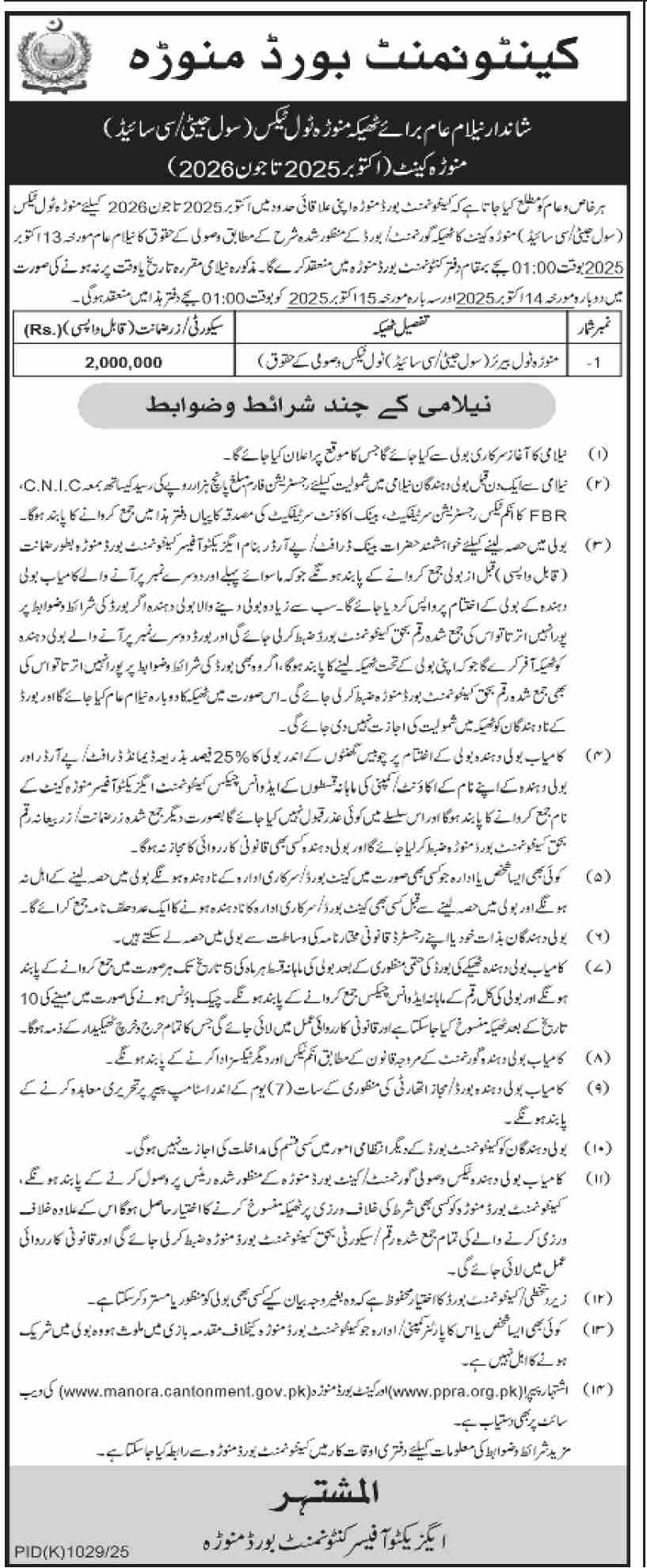 Cantonment Board Munora Tender Notice