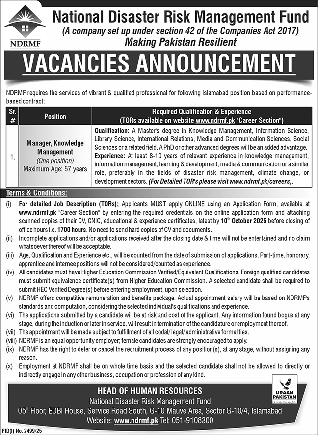 Jobs in National Disaster Risk Management Fund Islamabad