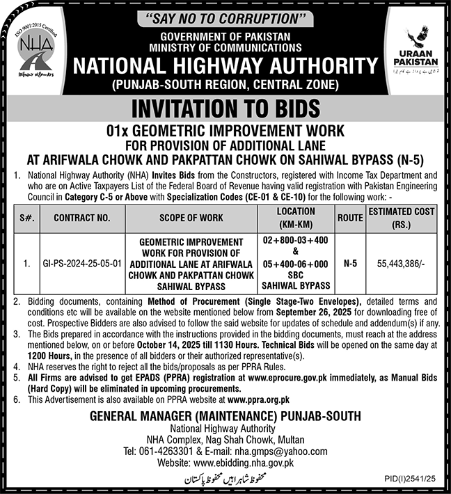 National Highway Authority Multan Tender Notice