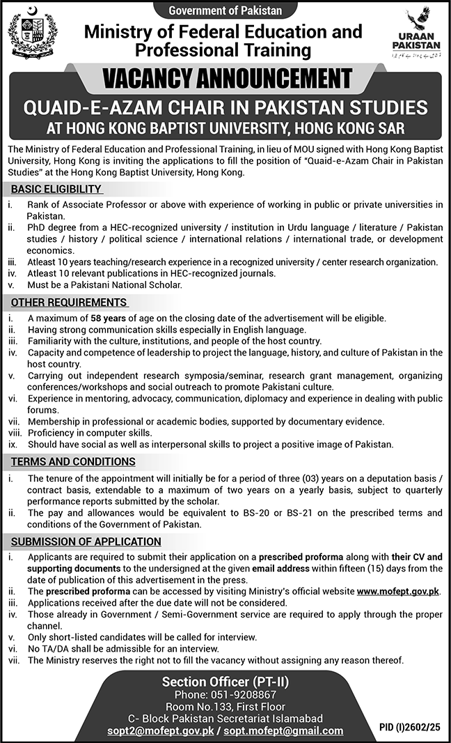 Jobs in Ministry of Federal Education & Professional Training Islambaad