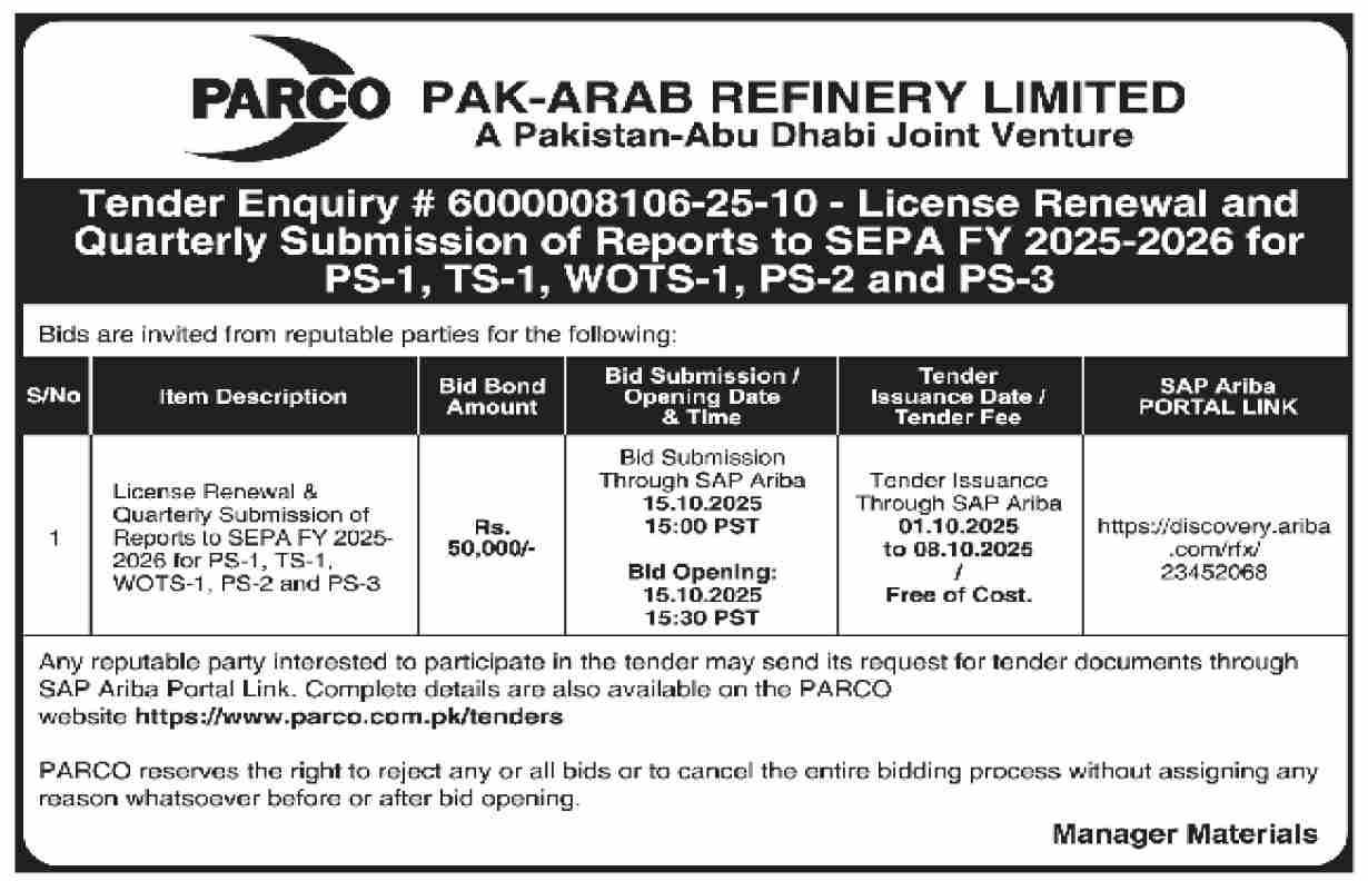 Pak Arab Refinery Limited Tender Notice