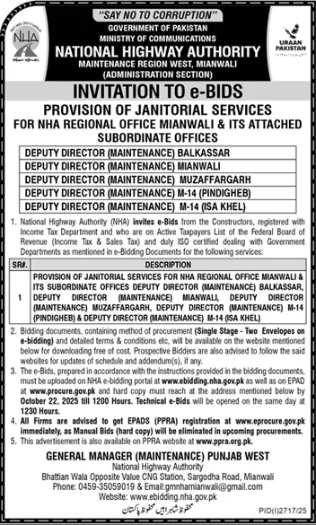National Highway Authority Mianwali Tender Notice