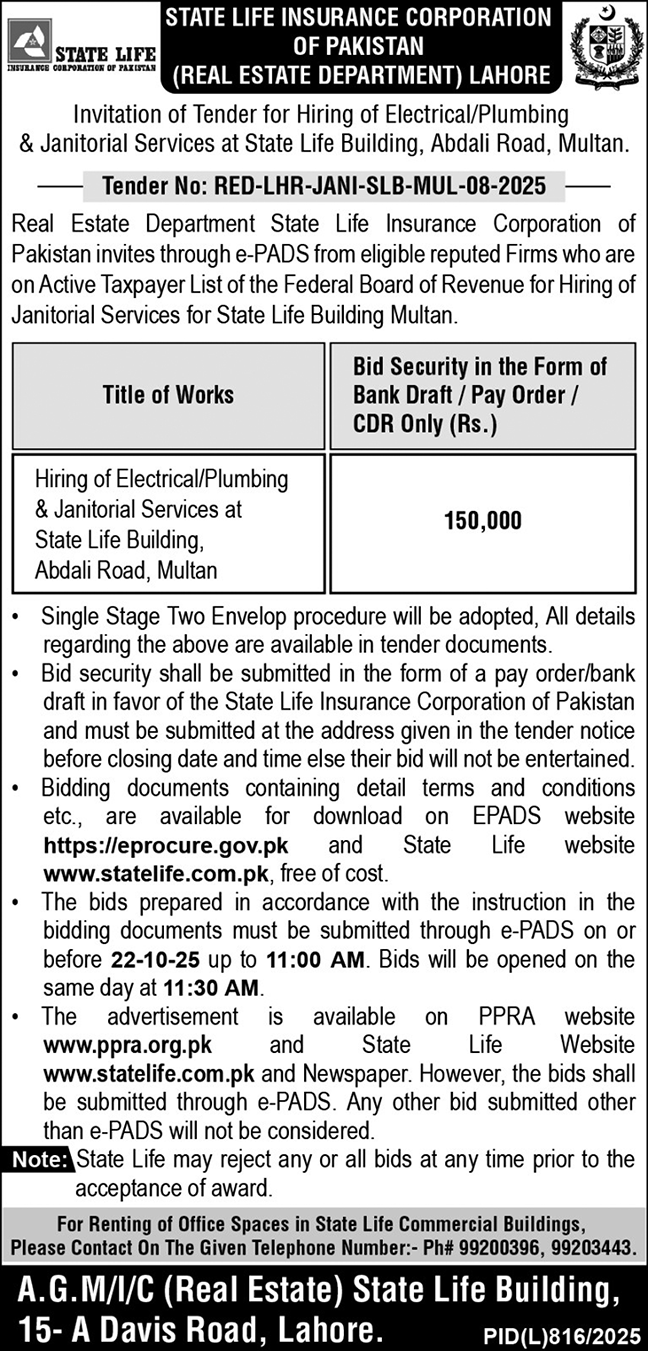 State Life Insurance Company Limited Lahore Tender Notice
