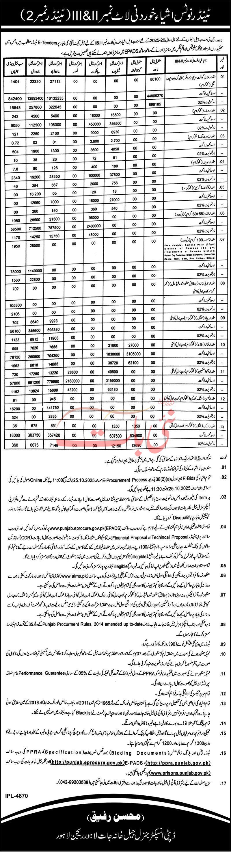 District Jail Lahore Tender Notice